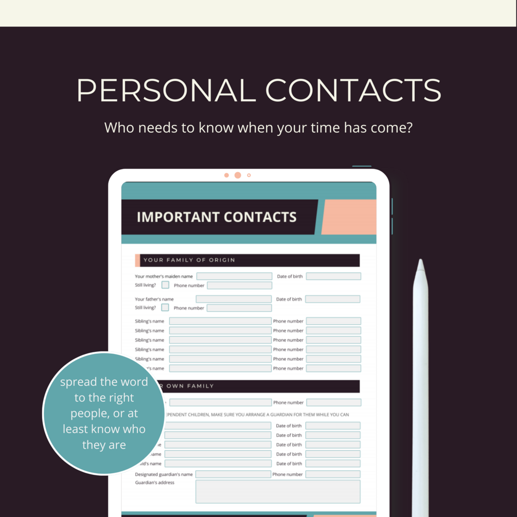 The pack includes a comprehensive master checklist of things to consider, covering all aspects of your life, from important documents and contacts to subscriptions and digital assets. This checklist will help you identify everything you need to plan for, ensuring that nothing is overlooked.