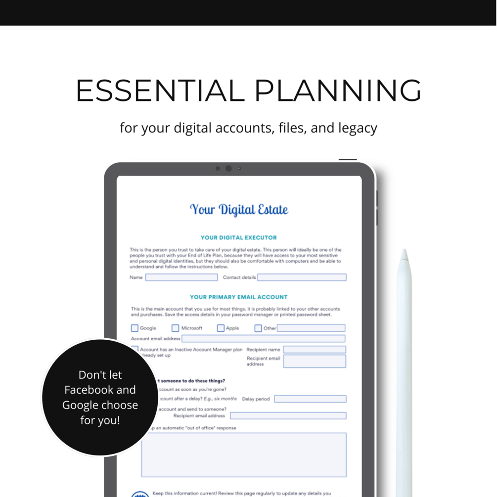 - a form for details about what to do with your digital estate (your online accounts and files, including social media)