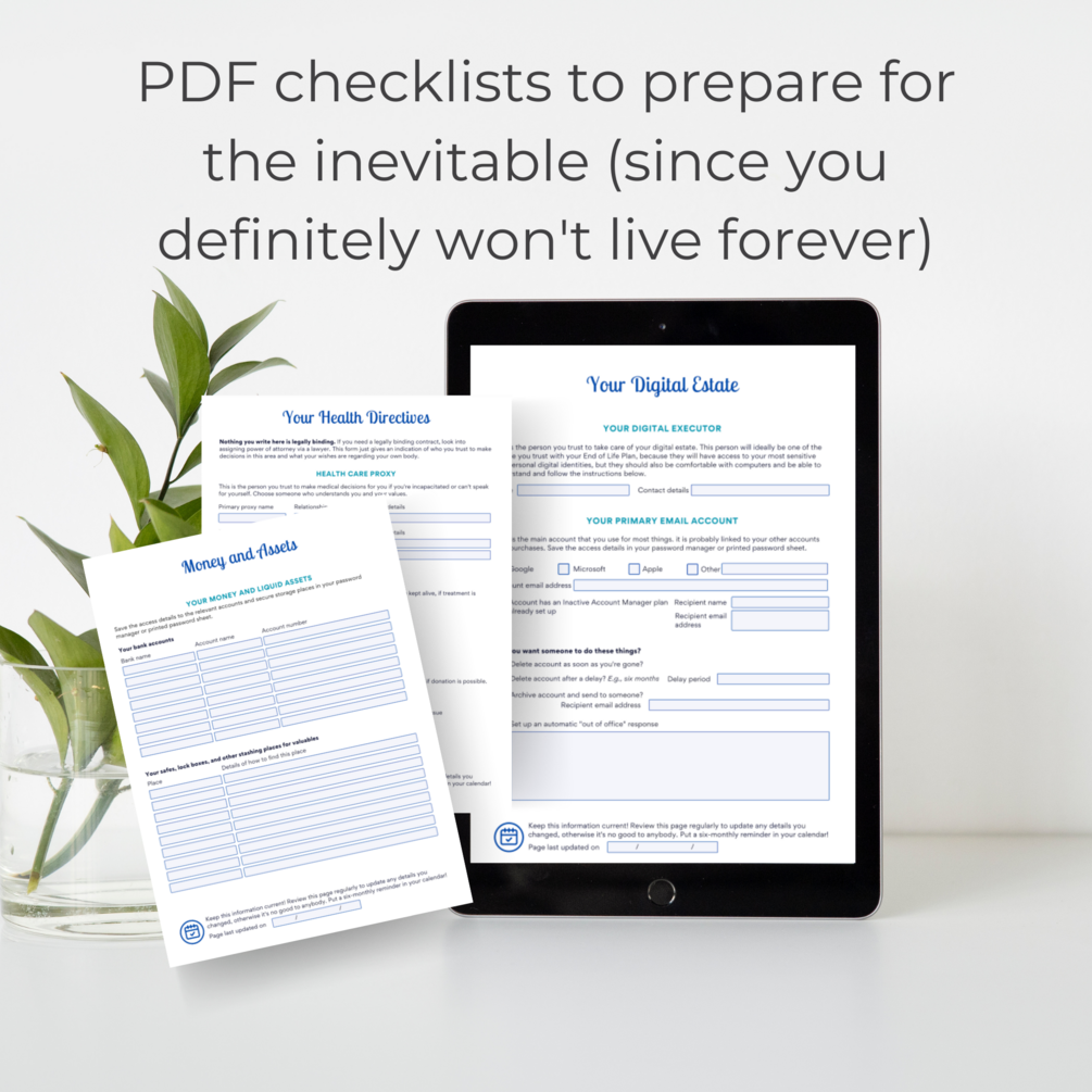 Please note that using this pack will not create a legally binding document. If you want something legally binding, see a lawyer (especially if you are writing your will). The purpose of this pack is to make sure you consider the things which don't belong in a legally binding document but will be incredibly helpful to the people who loved you and are left behind to take care of your things.